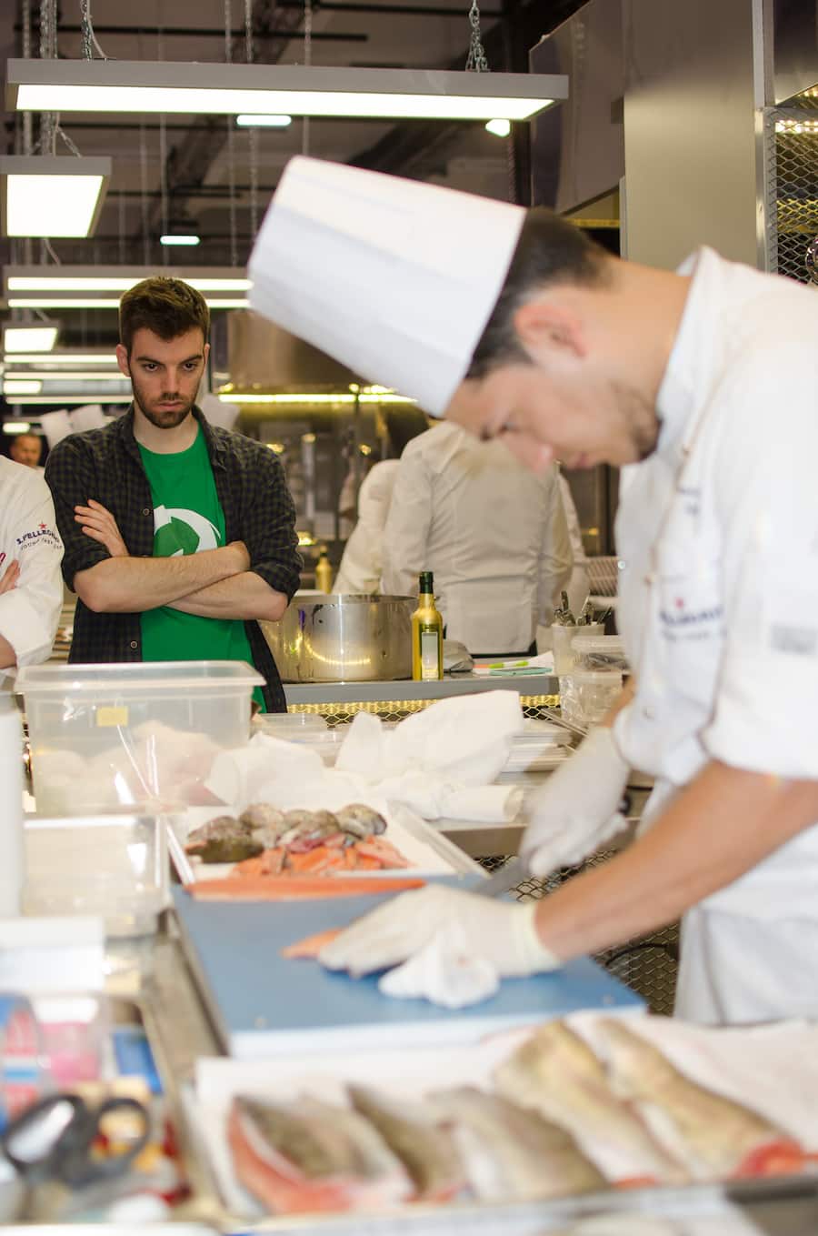 Konkurrenz. Im Vorfeld des Wettbewerbs war Wälti noch nicht so nervös. Beim Filetieren der Lachsforelle merkt man ihm die Anspannung an. «Jetzt ist er nervös und er verzettelt sich, das merkt man», sagt sein Mentor André Jaeger. Doch der erfahrene Mann redet Dave gut zu, gibt ihm etwas zu trinken. Es läuft wieder. Das Interesse an dem Schweizer ist gross, viele schauen interessiert zu. Der Berner hat sogar Zeit, ein paar Dinge zu erklären. Auch die Konkurrenz schaut ihm gespannt über die Schulter. David Andrés, der Spanien und Portugal vertritt, will ganz genau wissen, was Dave macht.