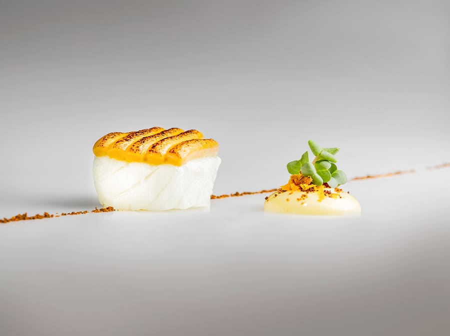 Seehecht mit Gänseleber, Miso, Chili und Yuzu von Heiko Nieder.