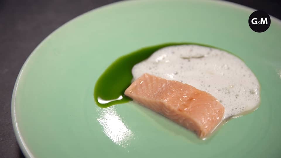 Andreas räuchert die Forelle schön glasig. Aber: Star im Teller ist die luftig-leichte Buttermilch-Espuma.