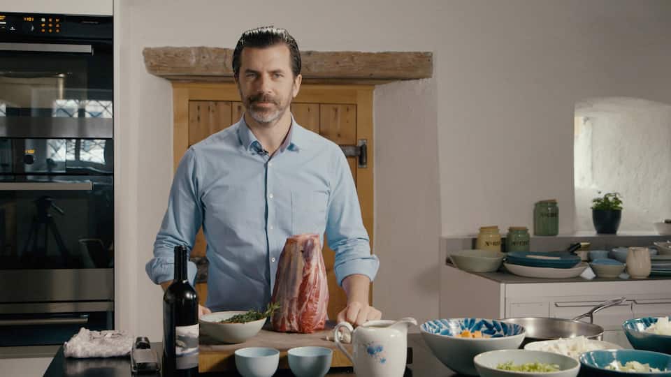 Für die ganze Familie! Andreas Caminada zeigt das perfekte Rindshaxen-Rezept. Es braucht Zeit und Rotwein.