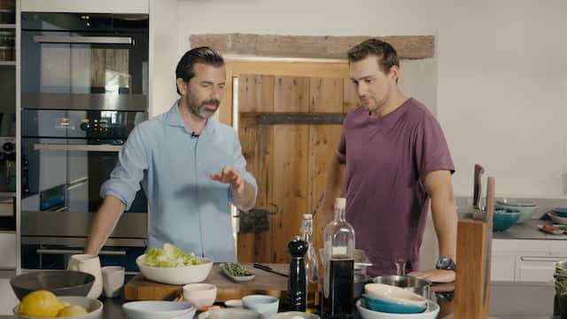 Andreas Caminada und NHL-Star Nino Niederreiter bereiten einen Salade Niçoise zu. Gesund, aber nicht einfach!