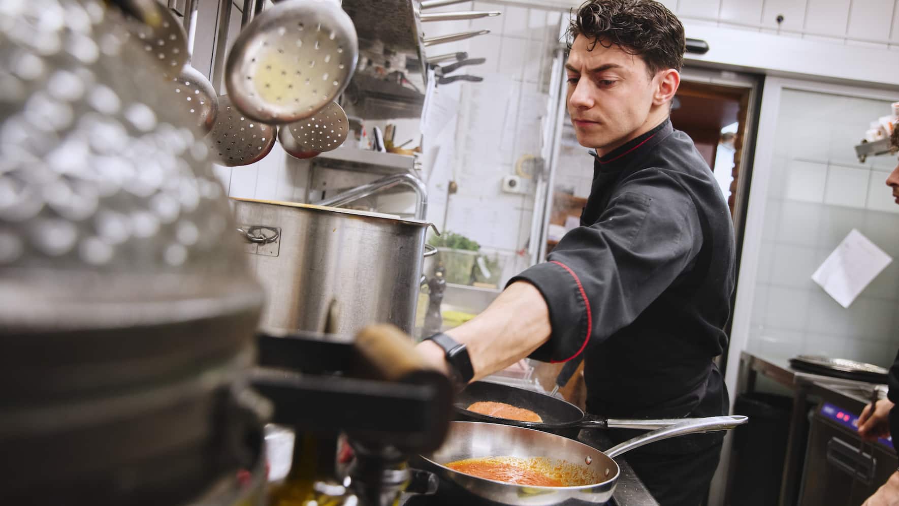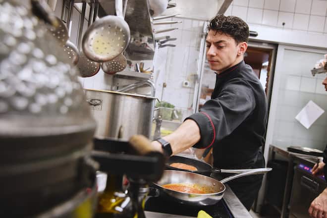 Stinco, Spigola, Sogliola. Stinco (Schweinshaxe), Spigola (Wolfsbarschfilets) und Sogliola (ganze Seezunge, im Ofen gegart) sind auch okay. Aber eigentlich sind die «Paste» bei Patron Daniele Apruzzese das grosse Thema: Mancini-Spaghetti mit Scardovari-Vongole aus dem Po-Delta, Carbonara senza panna (hoffentlich auch!), Tonarelli Cacio e Pepe; bei Pfeffer und Parmesancrème bleibt’s nicht, auch ein Löffel Kaviar kommt über die dicken Nudeln. Auch gut: Die Paccheri, mit Rosmarin und vor allem mit weissem, grob geschnittenem Kaninchenragout. Nur die «Cassata» hat uns nicht so gefallen: Die ist eindeutig zu süss geraten.