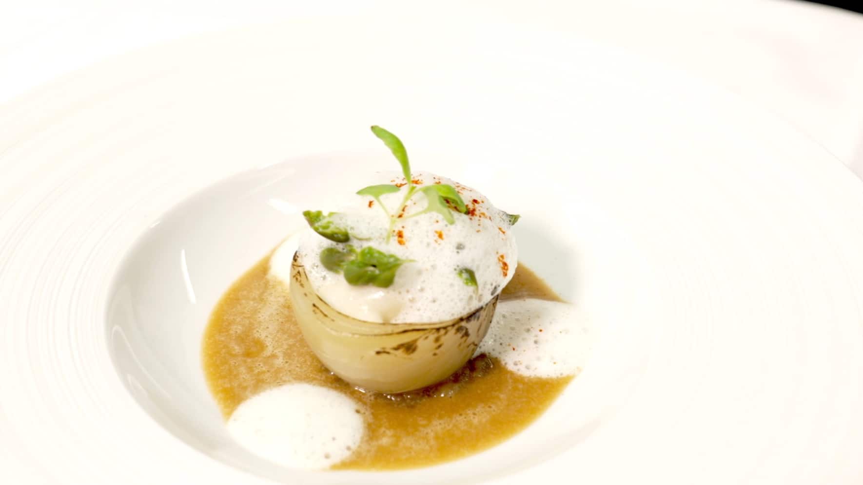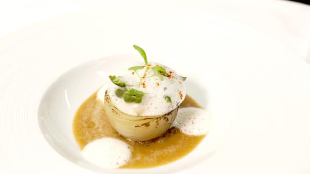 Armel Bedouet (L'Aparté (GE), 17/20) utilise l'oignon comme contenant et agrémente le tout de sauce poulette.