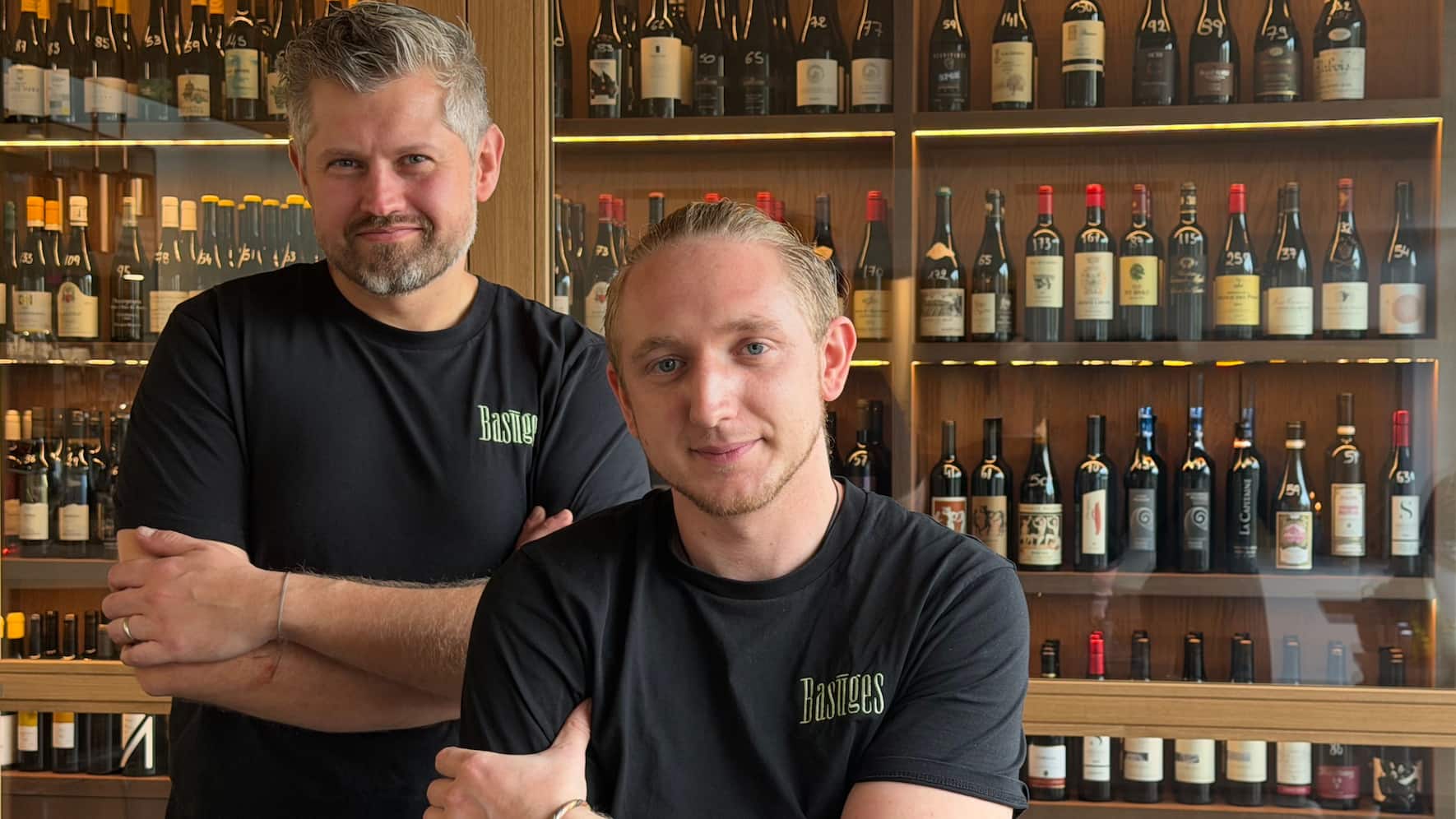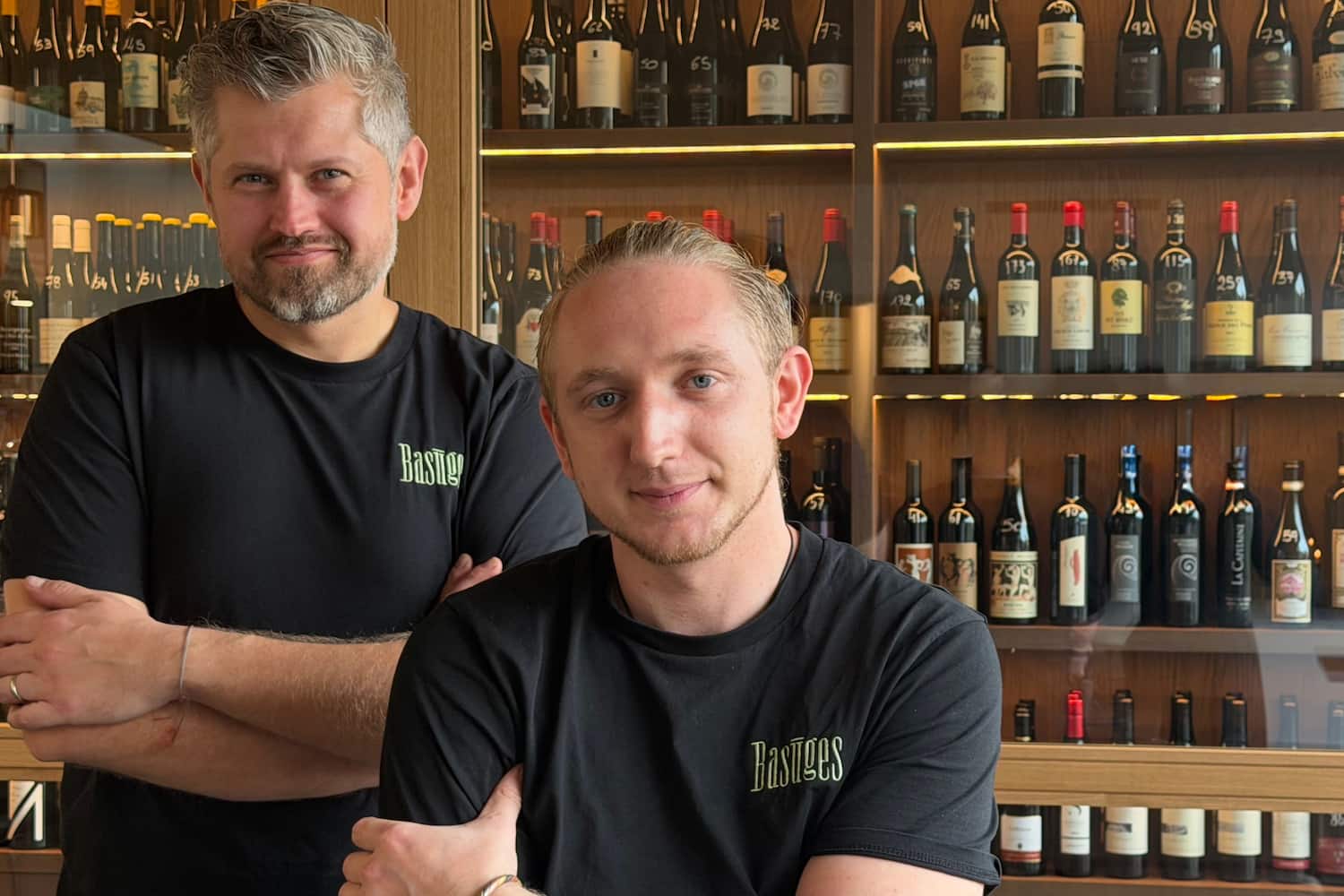 Bistrot. Ouvert mi-octobre, le Basuges se définit comme un bistrot de village. «Nous voulions un lieu où les gens se retrouvent», raconte le chef Yann Klein, 38 ans (grande photo, à gauche). Située sous la tour de l'horloge, la bâtisse est accueillait auparavant un salon de coiffure. Pierres et poutres sont toujours visibles et donnent un côté rustique qui contraste avec le cuivre de l'élégant comptoir, et le verre de la cave à vins. Cheveux et bouc poivre et sel, le chef ne tarde pas à nous inviter à y entrer. «Dans un bistrot, l'aspect vins est important», argumente-t-il, énumérant quelques-unes de ses 180 références «pas choisies sur un catalogue, mais après être allé à la rencontre des vignerons», précise-t-il. Environ «50% des vins proviennent de La Côte, 20% de Bourgogne, et 25% d'ailleurs», ajoute-t-il. Il y en a pour toutes les bourses: les bouteilles sont proposées de 29 à 300 francs.