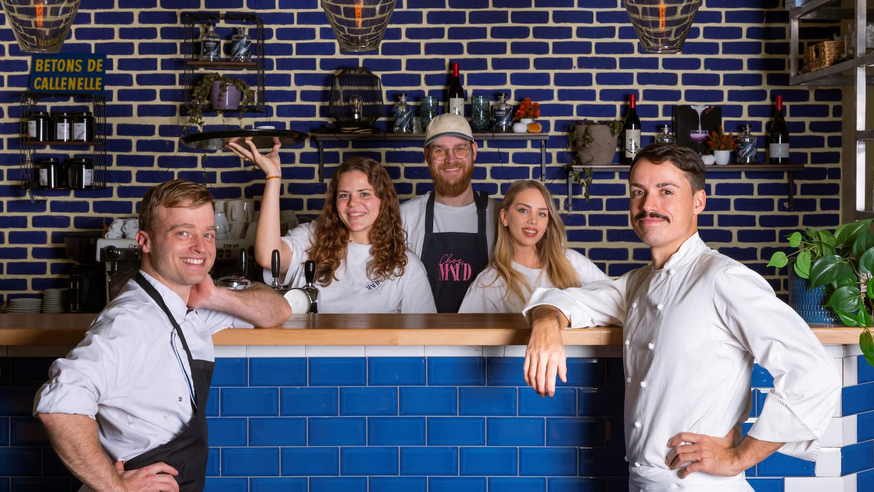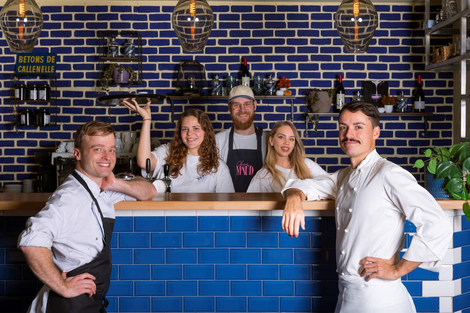 Roulez jeunesse. C'est un restaurant qui fait du bien, et pas seulement parce qu'il remplace l'AO, qui était tombé… bien bas ces dernières années. Repris par une toute jeune équipe, rebaptisé Chez Maud, voici un restaurant à l'accueil chaleureux, bien dans l'air du temps, et qui célèbre le fait maison, dans une approche respectueuse de la santé et de l'environnement. (Photo de gauche à droite: Nicolas Lambert, Camille Semier, Raoul Sotornik, Anastasiia Lesyk, Emeric Charles)