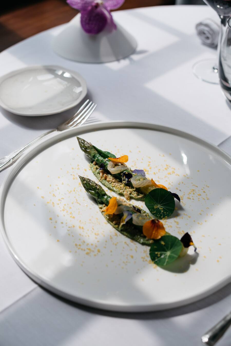 Les Asperges du Valais, fleur de capucine, raifort et féra fumée