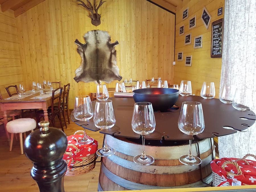 Au menu. Du mardi au samedi – le soir uniquement – ce petit chalet permet à 12 à 15 convives de déguster les fondues Wyssmüller (un authentique produit de la Gruyère testé et recommandé par GaultMillau) et des raclettes. Mais pas n’importe quelles raclettes : soit, on opte pour la demi-meule et l’on en mange à volonté pour 32 fr. (en râclant soi-même, ou en se laissant servir), soit on opte pour une version de cinq fromages cuits en raclonettes. Le tout assortit de charcuteries (18 fr. les 150 g, 29 fr. les 250 g). Sympa!