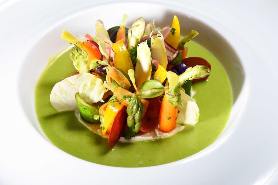 Un feu d’artifice de saveurs et de couleurs. Pour sa deuxième participation à la Veggie Week, la première fut couronnée de succès avec deux-cents menus végétariens servis en une semaine, Philippe Bourrel, qui adore travailler les légumes, a imaginé deux menus à choix servis midi et soir durant quinze jours (60 fr. les 3 plats et un rapport qualité/prix imbattable). Ayant eu la chance de tester les deux, difficile de formuler des préférences, tant les assiettes de Philippe Bourrel, magnifiques architectures végétales, rivalisent de croquant et de saveurs en bouche. Sa salade de petits légumes mettrait à genoux le carnivore le plus invétéré, son œuf de poule croustillant et onctueux à la fois est à damner un antispéciste et sa mangue en trompe l’œil a failli finir inviolée tant il nous est apparu criminel de détruire cette œuvre d’art culinaire.