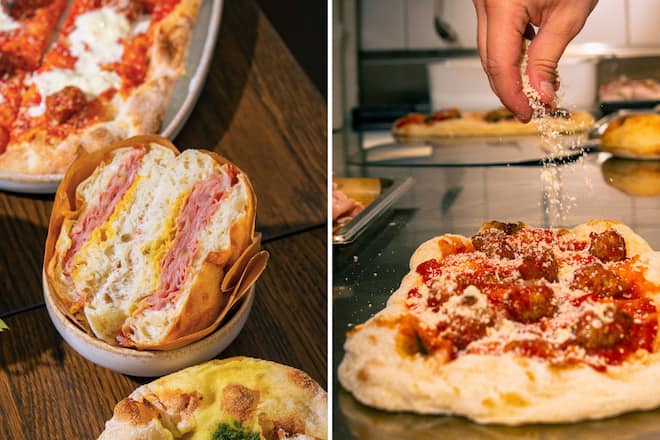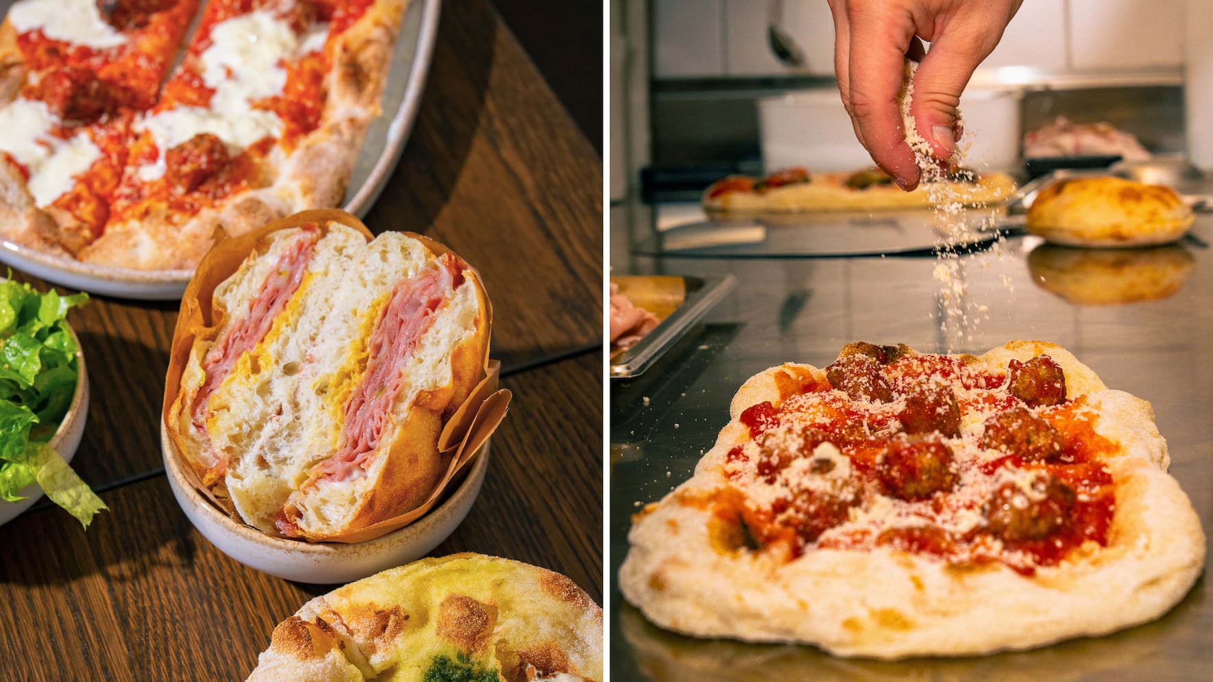 Pinsa? Plus vraiment une inconnue, la pinsa, cousine de la pizza, fait son nid dans cette nouvelle arcade des Eaux-Vives. L'adresse a été fraîchement ouverte par Jonathan Egger, secondé sur place par l'énergique et souriant Sasha Dubuis. L'arcade entièrement restaurée s’ouvre vers l’extérieur pour la commande de pinsas à l’emporter et propose aussi une vingtaine de places assises dans un décor confortable aux coloris pop, résolument dans l’air du temps, astucieusement imaginé avec la complicité du cabinet genevois Typology. (Grande photo ci-dessus: la bun mortadelle et la pinsa pompette)
