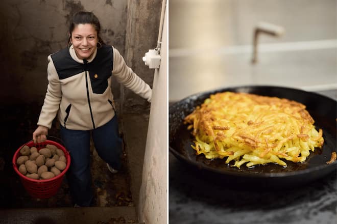 Boucher de 76 ans. «Pour les rösti et les frites, les variétés Agria, Erika et Ditta sont idéales. Hélas les pommes de terre Ditta ne sont pas disponibles toute l'année», explique Julia Pfäffli. Le deuxième ingrédient essentiel de ses paillassons de pommes de terre est le temps. «La poêle ne doit pas être trop chaude.» Cette experte en rösti utilise du saindoux ou de l'huile de colza provenant de la ferme de sa sœur. Et le résultat parle de lui-même. Son rösti est divin. Son intérieur moelleux et juteux, contraste parfaitement avec son extérieur croustillant et doré. «Tout le charme d'un rösti réside dans ces jeux de textures, c'est pourquoi il ne doit pas être trop fin», explique-t-elle. La saucisse qui accompagne le rösti a été confectionnée par cette passionnée de cuisine à partir d'un cochon entier, tête et abats compris, en collaboration avec le boucher Emil Weber, 76 ans,