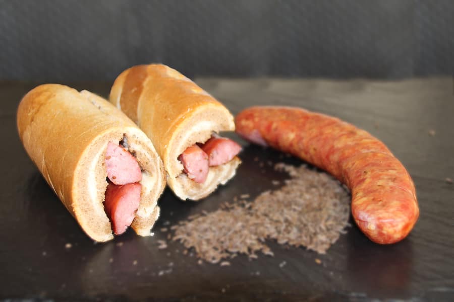 La saucisse d’Ajoie. C’est une saucisse de porc au cumin crue et fumée, à manger cuite. Si la Saucisse dite «d’Ajoie» est fabriquée uniquement dans le district de Porrentruy et est inscrite au registre fédéral des indications géographiques protégées (IGP), on trouve un peu partout dans le canton du Jura ainsi que dans le Jura bernois des «saucisses de ménage», «saucisses au cumin» ou «saucisses à cuire» élaborées selon les mêmes principes et ingrédients. Ces saucisses sont consommées toute l’année, avec un pic au moment de la Saint-Martin.