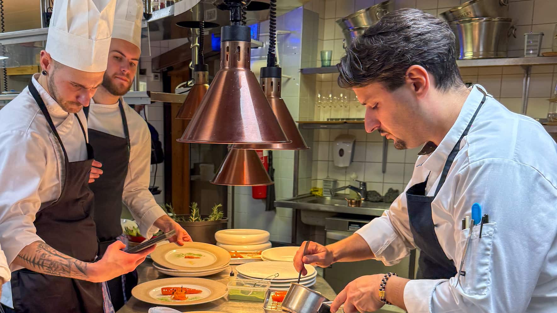 Sereins. Cette saison voit ainsi arriver Antonio Piattella (photo ci-dessus, à droite), 34 ans, nommé à la place de Sebastiano Lombardi, parti après sept ans. Malgré son expérience d'un an ici-même, en tant que second puis chef, l'Italien originaire des Abruzzes a fort à faire pour maintenir, voire élever, le niveau de ce restaurant, le mieux noté à Verbier, avec 17 points et une étoile Michelin. Ce qui n'a pas l'air de l'inquiéter outre mesure, ni lui, ni son patron Eric Cachart: «On a ressenti une certaine pression avant la sortie cet automne du GaultMillau et du guide Michelin. Comme nous avons maintenu nos notes, nous sommes à présent plus sereins, on sent que l'équipe est dans une bonne dynamique pour cette nouvelle saison».