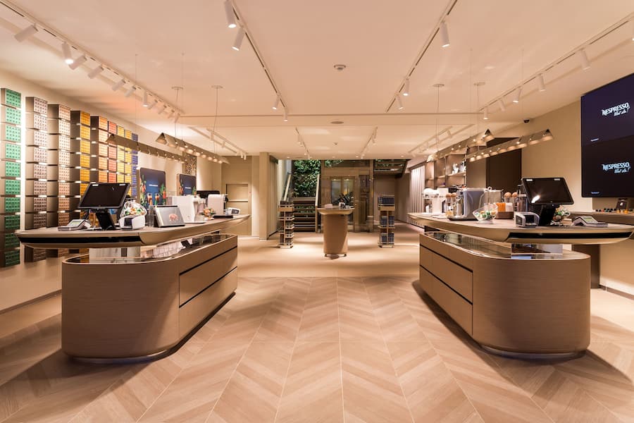 Durabilité. Dans une optique de développement durable et de recyclage, Nespresso mise sur l’utilisation de matériaux qui vont dans ce sens pour l’aménagement de ses boutiques. Espaces ouverts et clairs qui veulent rappeler l'environnement verdoyant des plantations de café. Quant aux plateaux, ils sont réalisés avec un mélange de marc de café recyclé provenant des centres de productions Nespresso en Suisse et de résine naturelle. La boutique comprend également un point de collecte pour les capsules Nespresso usagées.
