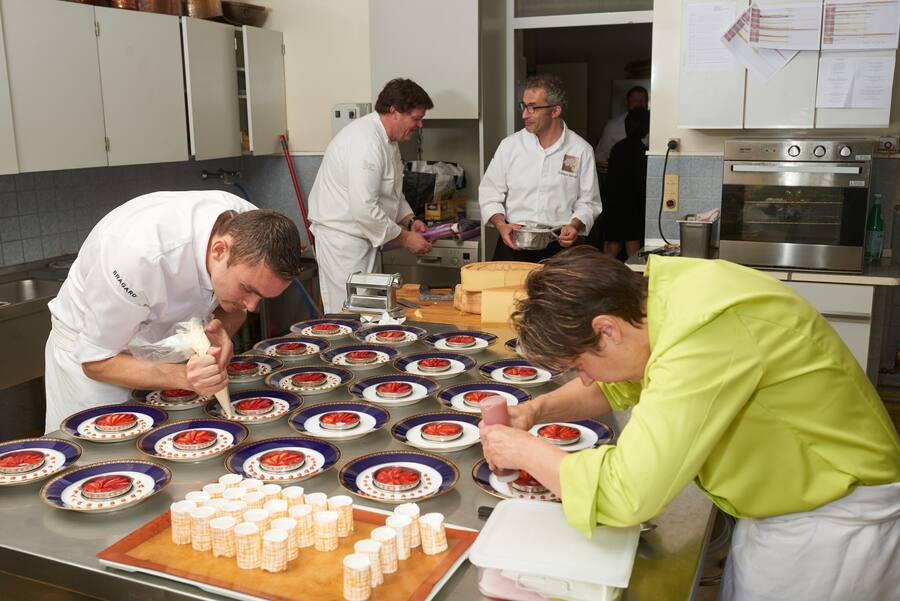 Chefs suisses. Pour assurer cette nouvelle mission de diplomatie gastronomique, les Grandes Tables de Suisse n’ont pas délégué les moindres de ses membres: Bernadette Lisibach (Neue Blumenau, Lömmerschwil, 16/20), Lorenzo Albrici (Locanda Orico, Bellinzona, 16/20), Guy Ravet (L’Ermitage des Ravet, Vufflens-le-Château, 19/20) , Pierrick Suter (La Table des Suter, Lucens, 17/20), ont accompagné le Président de l’association, Pierre-André Ayer. Et pour parfaire cette « dream-team », Paolo Basso, meilleur sommelier du Monde en 2013 s’occupait du choix et du service des vins, tous exceptionnels. Pour les soutenir, Michel Roth, le plus parisien des grands chefs helvétiques (l’ex-chef du Ritz qui officie au Bayview de l’Hôtel Président Wilson, à Genève, 18/20) est également venu.