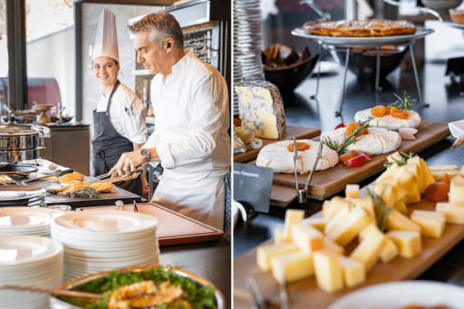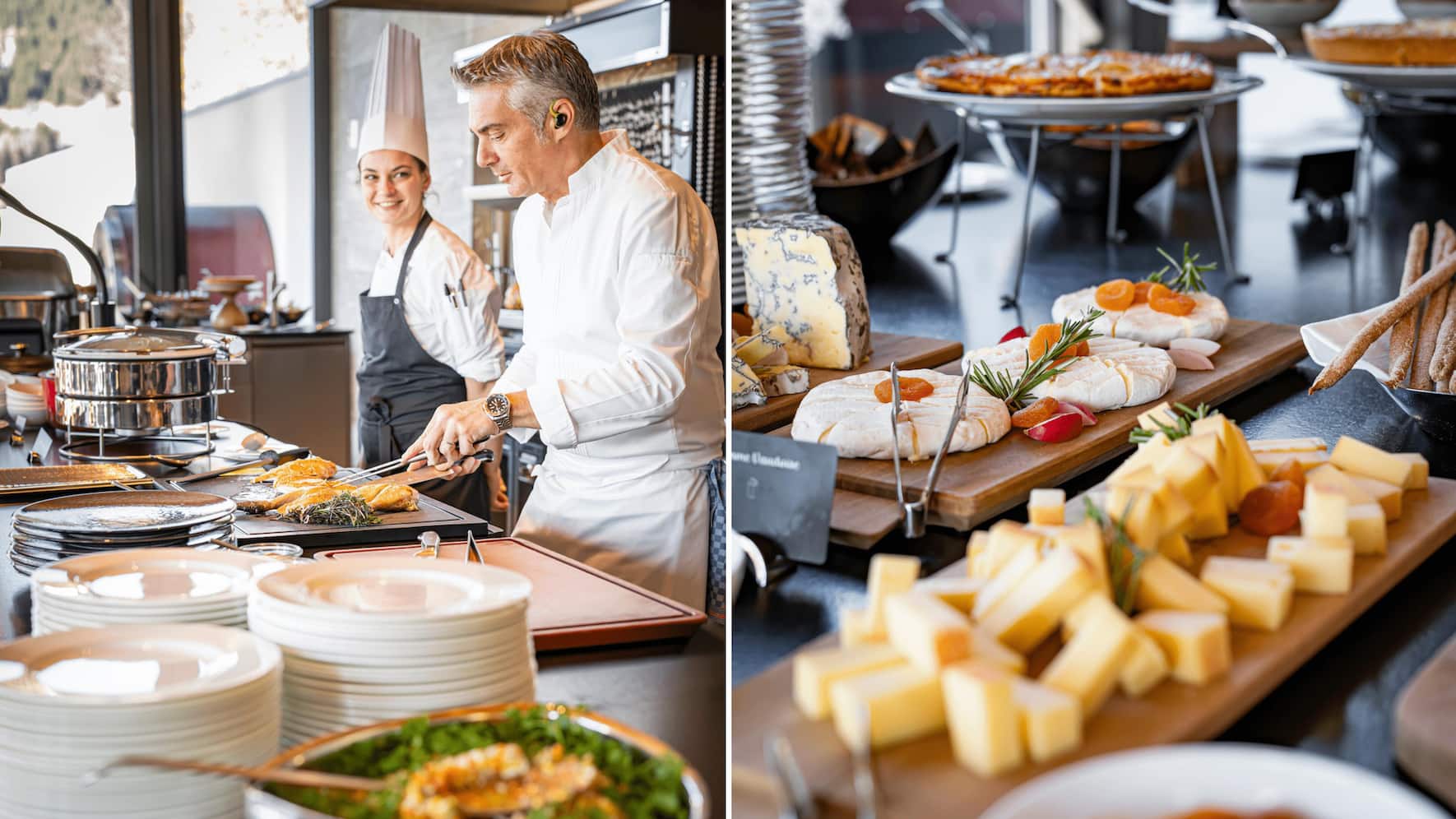 Poulet avec vue. Avant de dévaler les pistes de ski, de buller au spa ou de partir pour une balade en raquette, ce beau buffet, servi dans la jolie salle de restaurant avec vue sur les Dents du Midi, propose des plats simples cuisinés avec un supplément d’âme. En vedette, la broche où patientent une volaille pattes noires de la Belle Luce en Gruyère, un rôti du porc de Valentin Chappuis au miel, un rôti de boeuf du Val d’Hérens ou, encore, un rôti de veau du Simmental. Autour de ces pièces maîtresses, à la cuisson parfaite, les propositions sont elles aussi impeccablement sourcées. Les charcuteries sont vaudoises et valaisannes, la sélection de fromage provient de chez le célèbre Duttweiler.