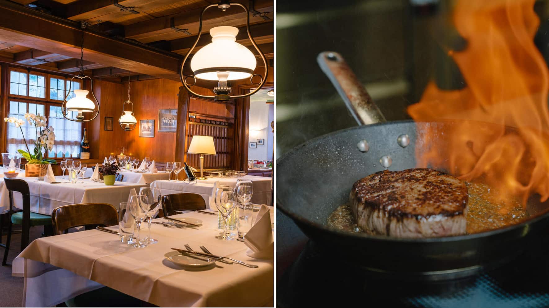 167 ans. Il existe peu de restaurants à Zurich qui, année après année, affichent une telle affluence que l’Oberes Triemli. Même un banal mardi midi, la réservation est vivement conseillée. La raison? L’accueil chaleureux du patron Fabian Gallmann et de son équipe, mais également la cuisine irréprochable, bourgeoise au meilleur sens du terme. Dans ce lieu d’exception, dirigé par la même famille depuis 167 ans, les habitués retrouvent des visages et des goûts familiers. Le professionnel de la restauration Norbert Eschmann fait partie de l’équipe du Triemli depuis 22 ans, le chef de partie Caspar da Silva depuis 30 ans. Quant au patron historique, Heinrich Gallmann, il continue de traverser les salles à manger avec des plateaux lourdement chargés. (Grande photo ci-dessus: la salle rustique du restaurant et le filet de bœuf Rossini flambé)