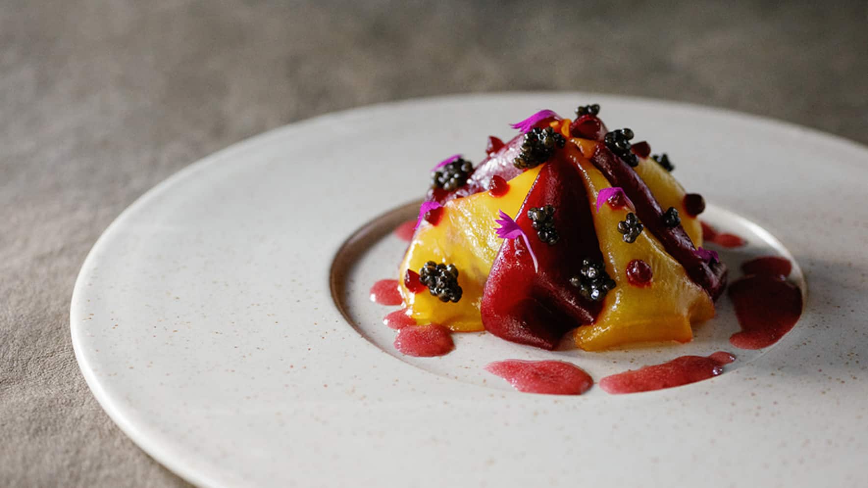 - Tailler le reste des betteraves en petit dés, ajouter les pickles de betterave et les feuilles de shiso ciselées finement et assaisonner avec un peu de vinaigrette.
