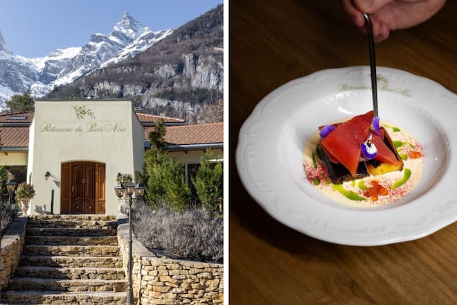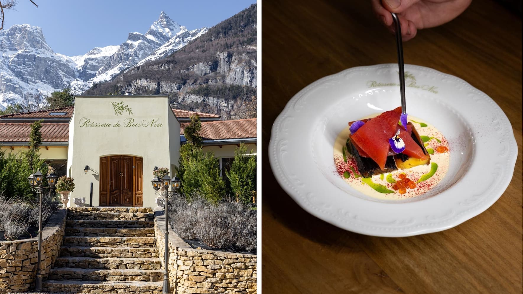 L'esprit d'Escoffier. Aux fourneaux, on trouve le Breton Tom Fournier, 28 ans, formé au Ritz à Paris, en Croatie et en Autriche, avant de s’installer en Valais. Ambitieux, il met un point d’honneur à faire perdurer l’esprit d’Auguste Escoffier. Son crédo: renouveler la tradition dans ce qu’elle a de meilleur à offrir. En salle, c’est Laurick Châtelier, originaire d'Orléans, qui, après avoir passé quatre ans au Four Seasons à Genève, veille sur une équipe avenante et efficace. Ensemble, ils doivent faire vivre ce Bois Noir qui affiche déjà complet presque tous les samedis du printemps, privatisé pour des mariages. En été, brasero et grillades autour de la piscine seront au menu.