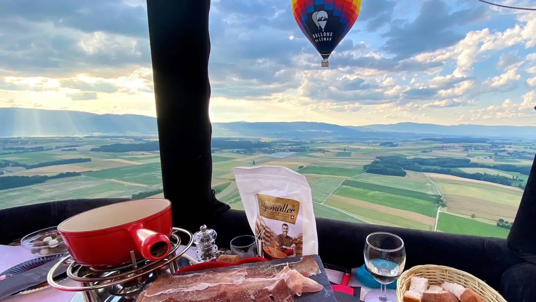 Dans le ciel avec les Ballons du Léman. Création, assemblage, tomate, poivre, truffe… C’est l’une de ces fondues Wyssmüller que l’on peut déguster lors d’un mémorable vol en montgolfière au-dessus du pays vaudois pour cette dégustation de très, très haut-vol! Exceptionnel!
