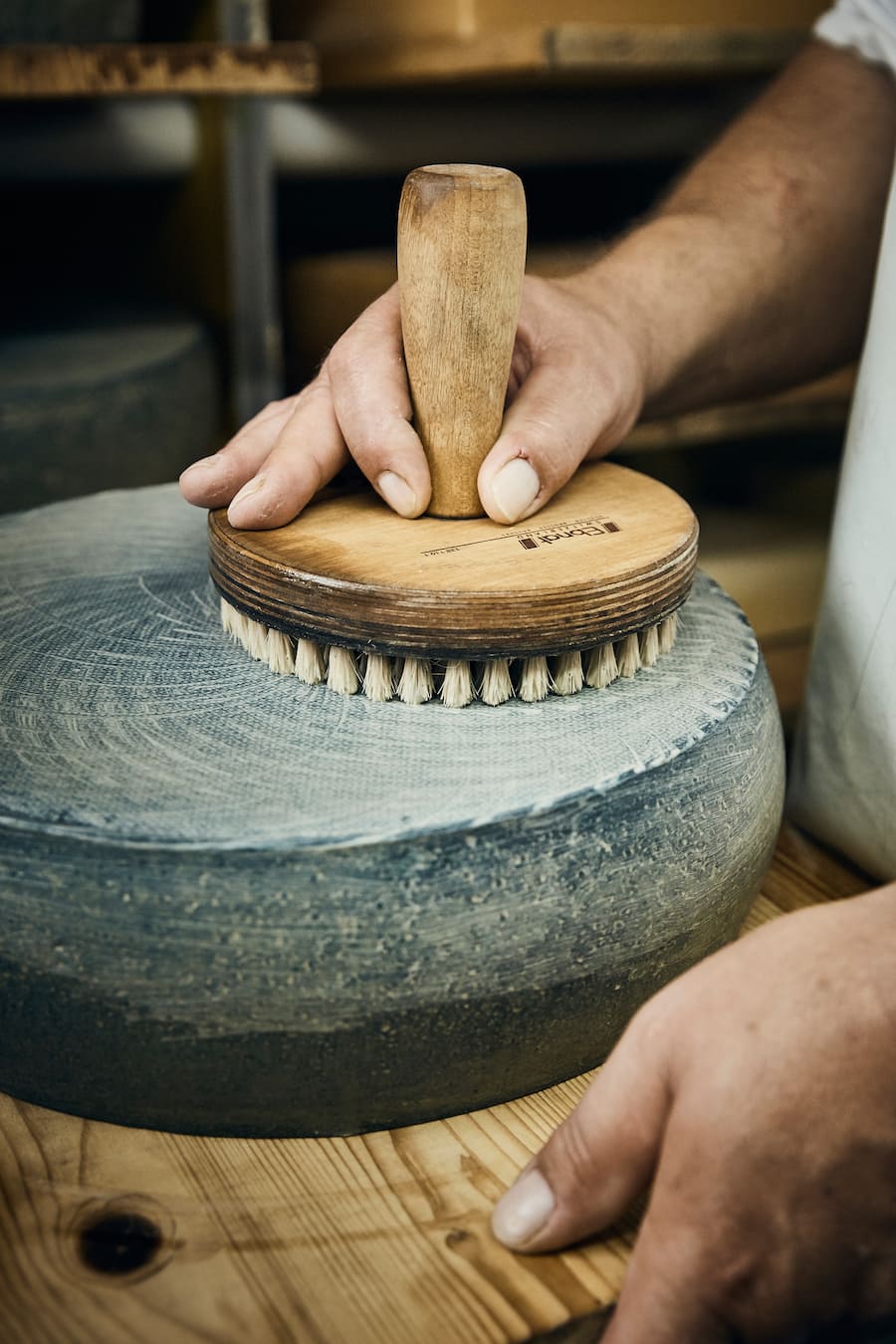 Schwarzes Gold. Den fand er in Adrian Schütz, Betriebsleiter der Dorfchäsi Utzenstorf BE. Der Käser und der Tierarzt mussten viel ausprobieren. So verwendeten sie zunächst Lebensmittelfarbe. Das Ergebnis: der Käse wurde violett oder grün, aber nicht schwarz. Die Alternative: Pflanzenkohle. «Als wir das erste Mal diese graue Käsemasse sahen, dachten wir nicht, dass daraus wirklich mal ein Black Cheese entstehen könnte», sagt Wampfler. Doch der Käse erhält zehn bis zwölf Stunden nach der Pressung seine intensive schwarze Farbe. Drei Monate reift der Käse in der Chäsi in Utzenstorf. Danach verlegt Wampfler die Laibe in seinen eigenen Käsekeller, wo er nochmals vier Monate bei perfekten Bedingungen lagert. Und natürlich muss das schwarze Gold gepflegt werden. Das ist die Aufgabe von Ruedi Klötzli, ein pensionierter Käser. Er schmiert den Käse mindestens zweimal pro Woche.