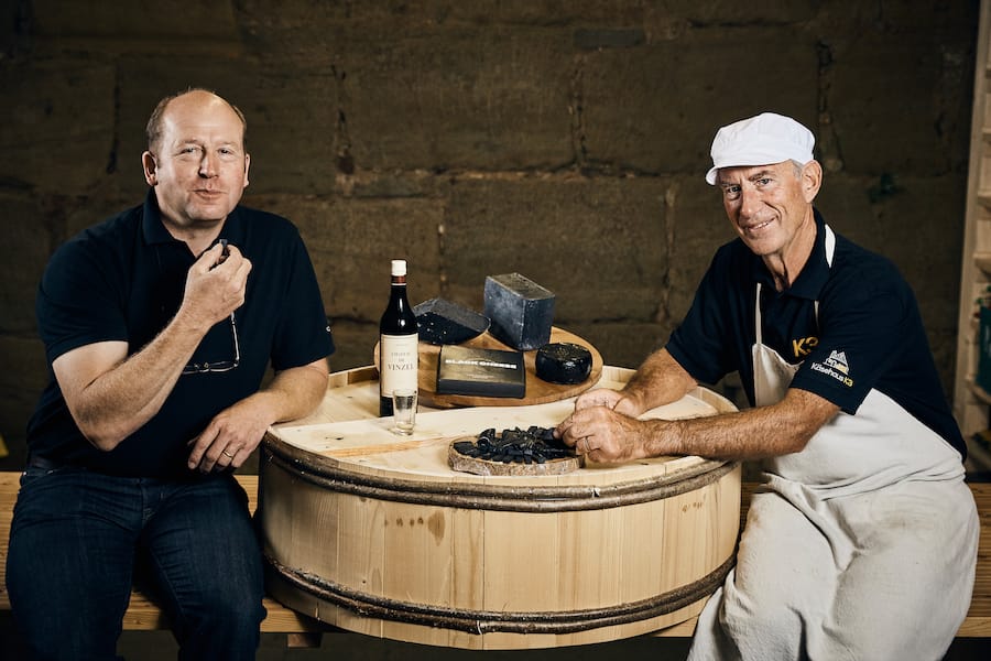 Eyecatcher. Dieser Käse fällt sofort auf: Der Black Cheese ist – wie sein Name nahelegt – schwarz wie die Nacht. Und einzigartig. Erfunden hat ihn ein Emmentaler. Beat Wampfler, eigentlich Tierarzt und Pferde-Chiropraktiker, kam beim Fernsehen auf die Idee. «Ich habe in der Sendung ‹Galileo› einen Beitrag über Black Food aus Japan gesehen, z.B. schwarze Burger. Da dachte ich mir: Wieso soll es nicht auch einen schwarzen Käse geben?» Dem Käse-Business völlig fremd ist der Tierarzt nicht. «Ich bin auf einem Bauernhof aufgewachsen und mein Grossvater ging früher immer auf die Alp und produzierte Käse.» Ausserdem entschied sich Wampfler 2015 das Käsehaus K3 in Burgdorf BE zu kaufen – oben ist es ein Kulturzentrum, unten ein Käsekeller. «Für den Black Cheese brauchte es also nur noch ein bisschen Mut und einen Käser, der das mitmacht.»