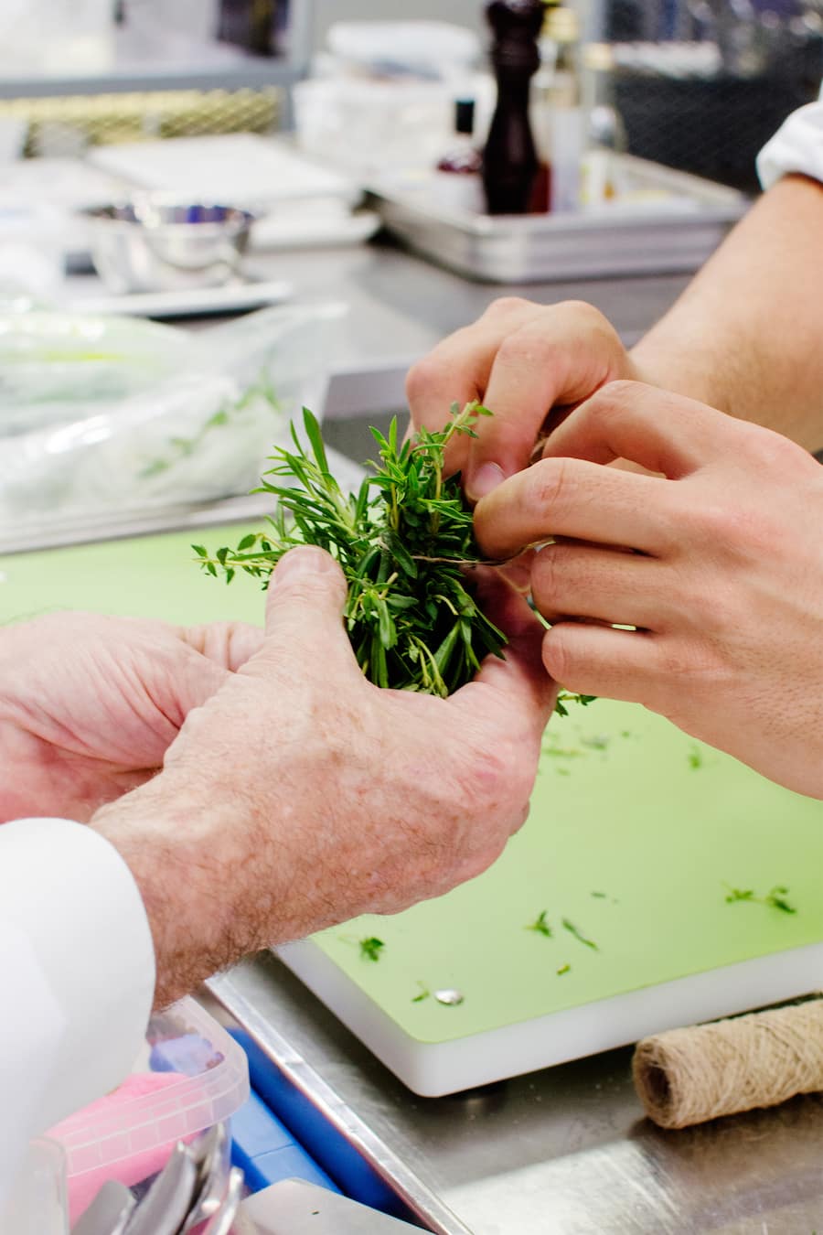Mentor André Jaeger hilft Dave Wälti beim Binden der Kräuter.