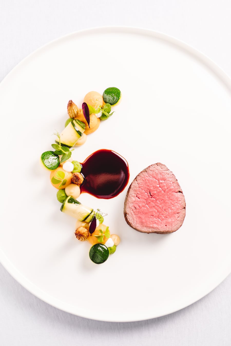 Rosa gebratenes Rindsfilet, Süsskartoffelpürée begleitet von cremigem und knackigem Gemüse.