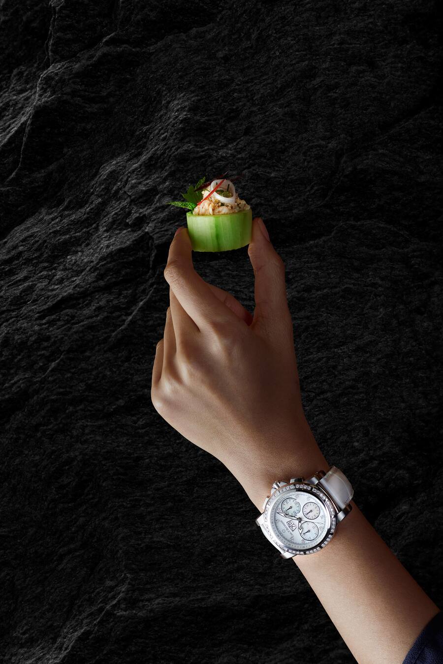Klein & fein: Thailändischer Pouletsalat, serviert in einer Gurke mit einer Patravi ChronoDate von Carl F. Bucherer.