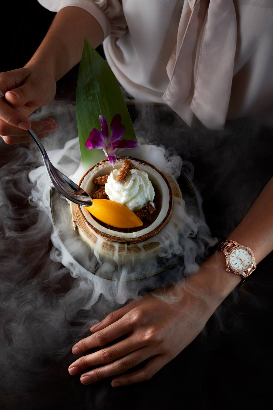 «Die Gerichte sind die Hauptakteure». Fabian Häfelis Konzept: «Die Gerichte sind als Hauptakteure im Fokus. Die Uhren stellte ich als stille, stilvolle Begleiter dazu. Ich wählte für das Shooting dezente Pastelltöne und ruhige Hintergründe.» Die frechste Kombination: Pathos Diva und Manero Flyback von Carl F. Bucherer zu einem von Trockeneis verhüllten Traumdessert: Kokosschaum, Yuzu-Gel, Bananenkompott, Mango-Passionsfrucht-Sorbet! Auch «Laab Gai», der thailändische Pouletsalat mit Milken oder ein Hamachi-Sashimi mit Kaviar, Algen und Ponzu kamen direkt aus der Küche ins mobile Fotostudio.