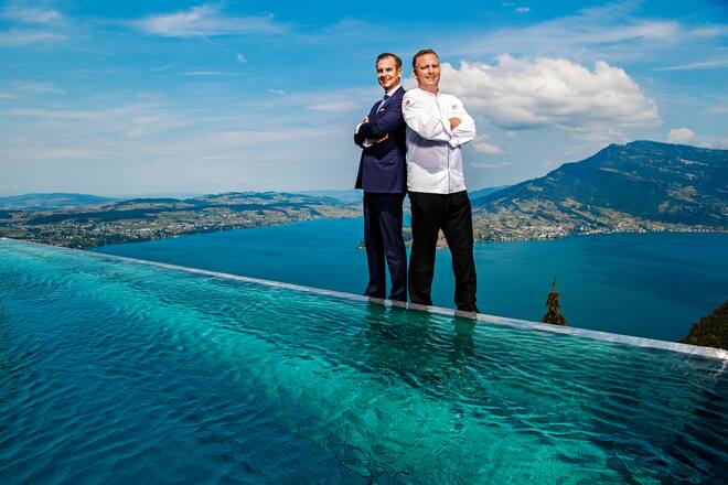 700 Mitarbeiter, 95 Köche! Im «Bürgenstock Resort Lake Lucerne» ist alles etwas grösser: 550 Millionen (aus Katar) wurden investiert. 700 (!) Mitarbeiter kümmern sich in vier Hotels um die Gäste. 95 Köche stehen am Herd. Vier Restaurants schaffen auf Anhieb den Sprung in den GaultMillau. Mit insgesamt 58 Punkten. GaultMillau-Chef Urs Heller: «Star auf dem Berg ist Mike Wehrle. Er ist nicht nur selber ein exzellenter Koch. Er ist vor allem auch ein hervorragender Küchendirektor. Er hat seine Mitarbeiter per Handy und Social Media auf der ganzen Welt rekrutiert, kümmert sich gut um sie und lässt sie kochen wie in ihrer Heimat. Die Restaurants des Resorts sind deshalb so authentisch.». So will es auch CEO Bruno Schöpfer, der Schöpfer des Hotelwunders Bürgenstock: «Fusion Cuisine ist nicht unser Ding!» Robert P. Herr ist der General Manager des Resorts.