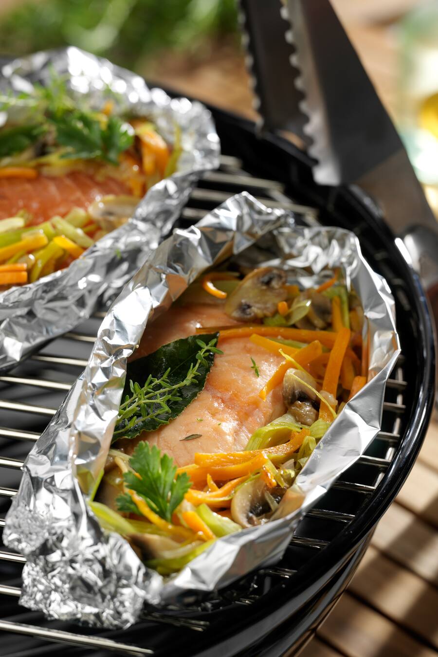 Fisch und Gemüse kommen gut in Alufolie auf dem Grill.