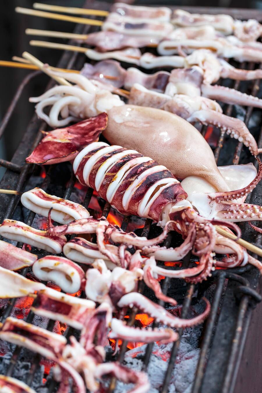 Tintenfischchen und Kalamari am Spiess nur kurz grillieren.