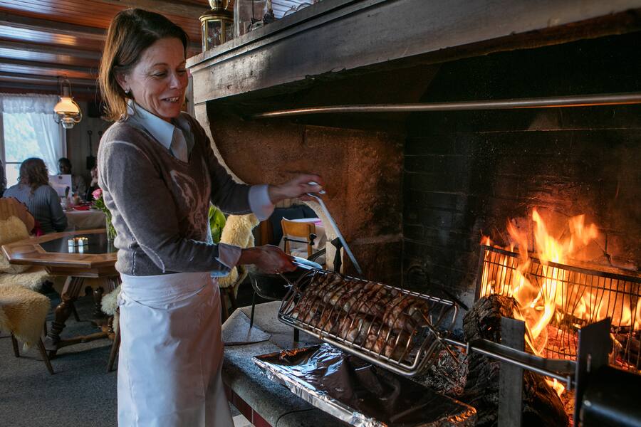 Chefin Ariane Meyer bereitet die Wachteln über dem offenen Feuer zu.