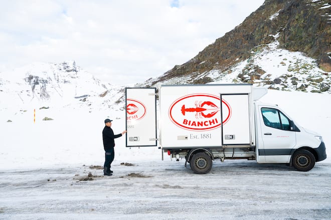 Mission erfüllt! Nach der Fahrt über den verschneiten Julier kommt der Bianchi-Camion pünktlich um 9.30 Uhr in St. Moritz an und parkiert seinen Camion vor dem «Badrutt's Palace», GaultMillaus «Hotel des Jahres 2026». Dort erwartet ihn Antonio Pavone, einer der Sous-Chefs des Hauses. Dem Koch steht die Freude über die exzellenten Produkte ins Gesicht geschrieben. Austern, Hummer, Gamberi, Lachs – endlich ist alles da!