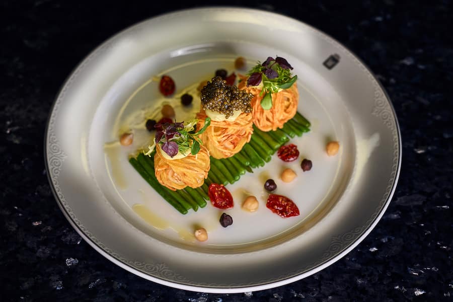 Jakobsmuscheln im Kartoffelmantel mit Wasabi-Aioli und Kaviar von Franz Faeh.