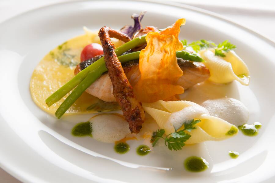 Lachsfilet, Conchiglie-Pasta mit Oktopus, Wildspargel und Hummerschaum.