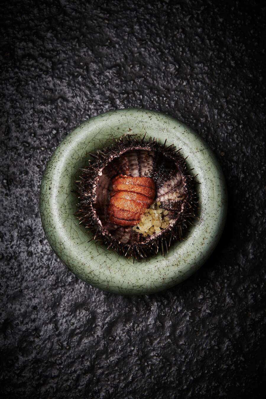 Seeigel mit eingelegten Petersilienstängel gehört zu den ersten Gerichten im Mehrgängemenü.