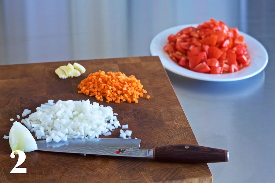 In einem grossen Topf Zwiebel, Rüebli und Knoblauch mit Olivenöl andünsten, ohne dass sie Farbe annehmen. Die Tomaten dazugeben, salzen und etwa 30 bis 40 Minuten ohne Deckel kochen lassen. Wenn die Rüebliwürfel weich sind, ist die Sauce fertig. Die Knoblauchzehe entfernen, und die Sauce durch die feine Scheibe eines Passevites drehen, die Kerne sollen dabei nicht durchgedrückt werden.