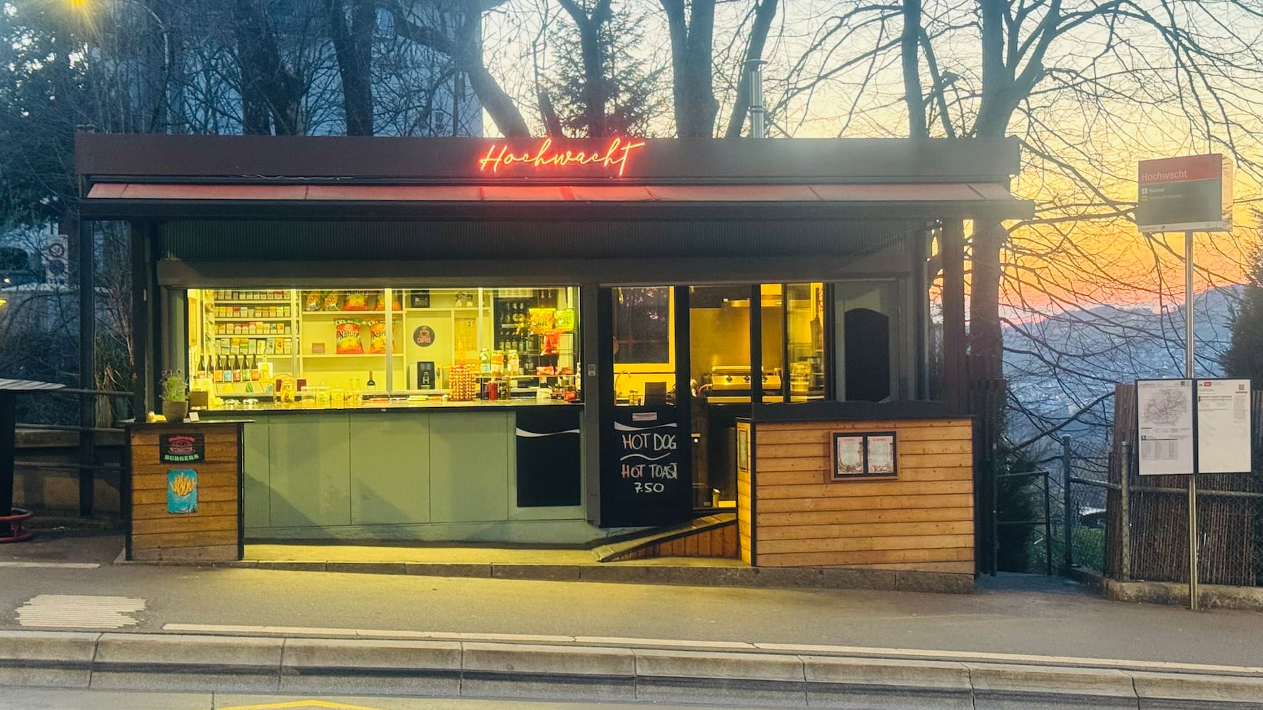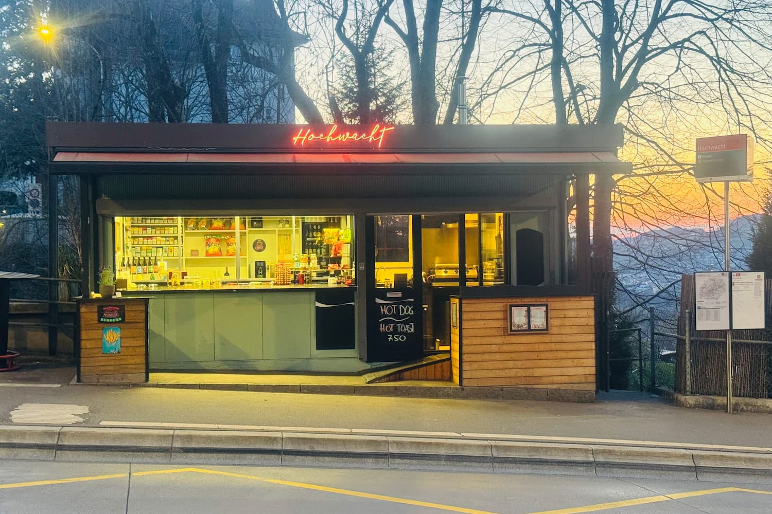 Von aussen verheisst der an eine aufgehübschte Baracke erinnernde Bau im Quartier Riethüsli wenig, aber der Kiosk ist nach der Eröffnung Anfang 2024 bereits eine feste Grösse. Nicht zuletzt wegen des Hochwacht-Burgers, der von erstaunlich hoher Qualität ist. Daneben ist der Kiosk natürlich auch ein Kiosk, es gibt Getränke, Chips, Früchte, Gemüse und mehr. Die Betreiber Verim Muharemi und Besnik Karakushi haben sich zum Ziel gesetzt, einen Treffpunkt zu schaffen – bisher mit Erfolg.