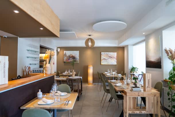 Auch schon seit fünf Jahren bietet Stéphane Nogueira im Dörfchen Senarclens bei Cossonay in seinem sympathischen Lokal überzeugende Bistro-Gerichte, vom Tatar bis zum Burger, und ein paar Klassiker aus seiner Heimat Portugal – etwa ein feines Pfännchen mit Vongole in Weisswein, Knoblauch und Schalotten mit einem Hauch Koriander. Zu empfehlen sind auch die gebratenen Eglifilets an Beurre blanc mit Zitrone oder das Lammfilet in Kräuterkruste an süsslicher Porto-Sauce. Gut schmeckt auch der «Apfel Eden», eine mit Apfelmousse gefüllte Schale aus weisser Schokolade.