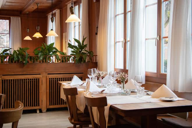 Fein waren als Amuse-bouches das Chorizo-Süppchen und die Schinken-Lachs-Rouladen mit hausgebackenem Brot, tadellos das Swiss-Lachs-Tataki mit Apfelstückchen sowie geschäumten Saucen aus Kiwi und Topinambur. In der am Tisch geschöpften und mit Kokos sowie Chili aromatisierten Zitronengrassuppe servierte der Chef frittierte Bällchen vom Suppenhuhn, aus der Region stammte das Heimiswiler Zanderfilet auf Federkohl-Gersotto. Zum zarten Kalbsfilet und zur 32 Stunden lang gegarten Kalbsschulter kombinierte die Küche gekonnt Gelbkartoffel- und Karottenpüree.