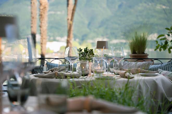Hoppla! Nicola Leanza hat im «Seven» einen eleganten kulinarischen Fallrückzieher vollzogen: weg vom ambitionierten Fine Dining hin zu mehr Einfachheit und Gemütlichkeit. Geblieben ist die traumhafte Aussicht auf den Lago Maggiore, der beeindruckende Weinkeller und die gelebte Gastfreundschaft. Den neuen Namen «\7 toc toc» kann man durchaus wörtlich nehmen. Wer eintreten will ins ehemalige «Seven», muss an der eleganten grünen Türe anklopfen: «Toc Toc!»