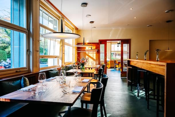 Er servierte uns zuerst Ziegenfrischkäse-Quadrolini der Berner Pasta-Manufaktur Ingredienza mit grünem Spargel und Pinienkernen, dann Mönchsbart mit pochiertem Ei und einer Kartoffel-Focaccia an aromatischer Morchel-Rahmsauce. Zum fein gegarten AlpenZander gab’s Spargel, Mangoldgemüse und ein asiatisches Miso-Dressing. Zart war die Kalbspiccata in Ei-Mehl-Panade, begleitet von intensivem Kräuterrisotto. Ein hübsches Kombi von Orange und Datteln machte den gelungenen Schluss. Sehr zuvorkommender Service.