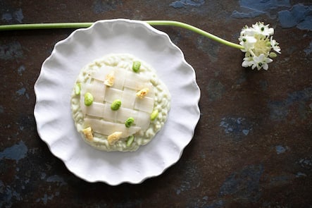 Risotto einmal anders: mit Saubohnencrème & Edamame. Ein veganes Rezept von Chef Ettore (Chenot Palace).