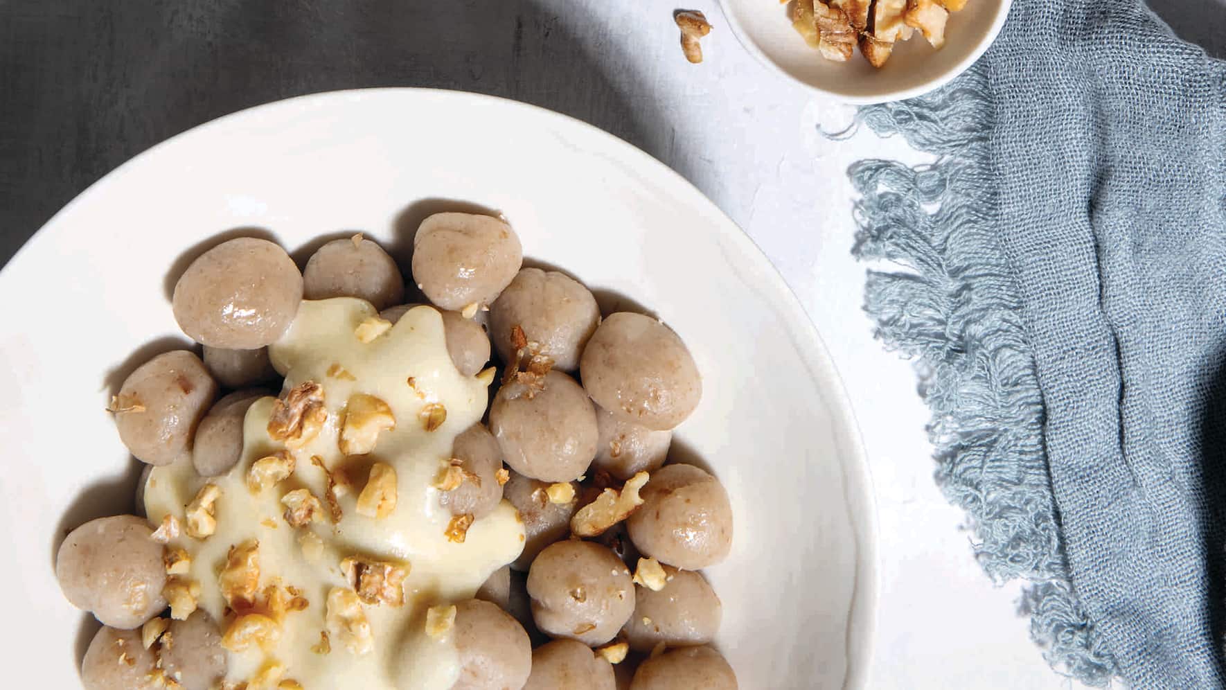 - Die Gnocchi mit der Käsesauce in Tellern oder einer Schale anrichten und mit gerösteten Baumnüssen und eventuell Traubenhälften bestreuen.