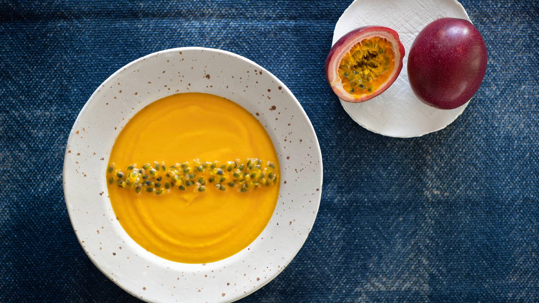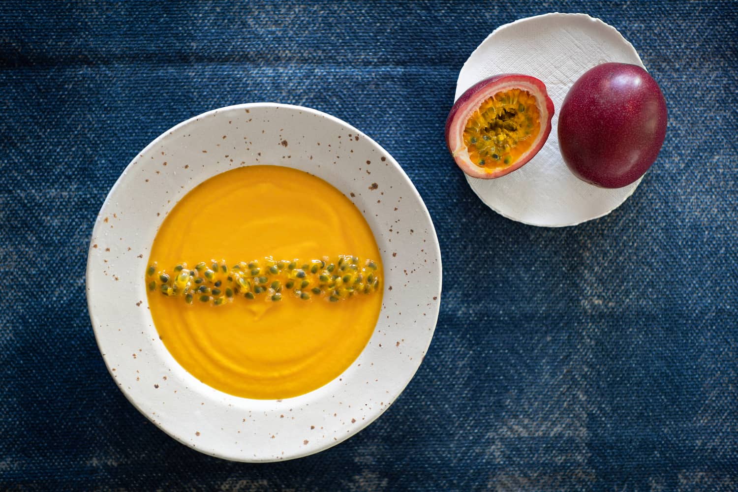 - Zum Schluss den Anis entfernen und alles zusammen pürieren. Die Suppe in einer Schüssel servieren und die Passionsfruchtkerne darauf verteilen.