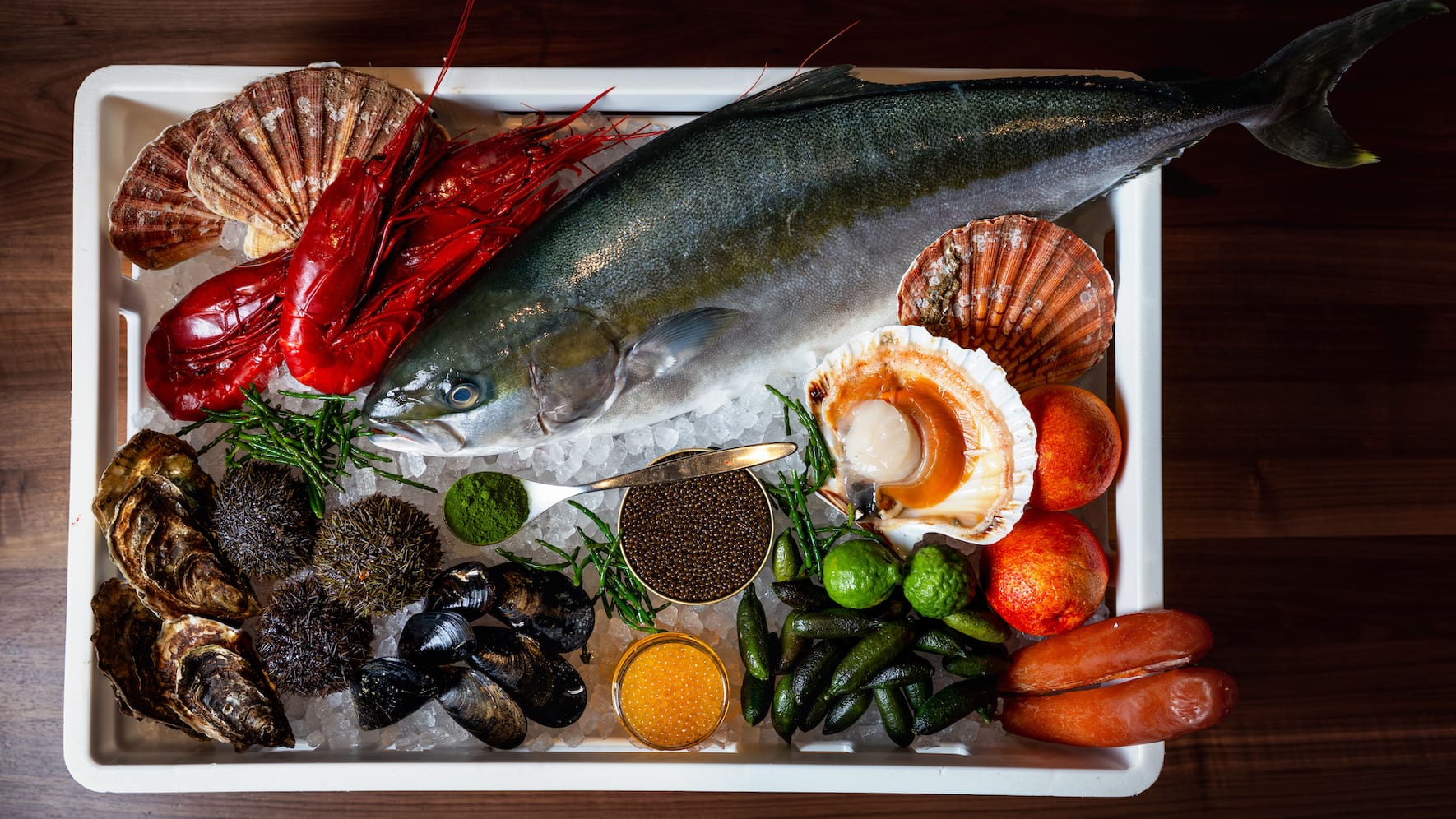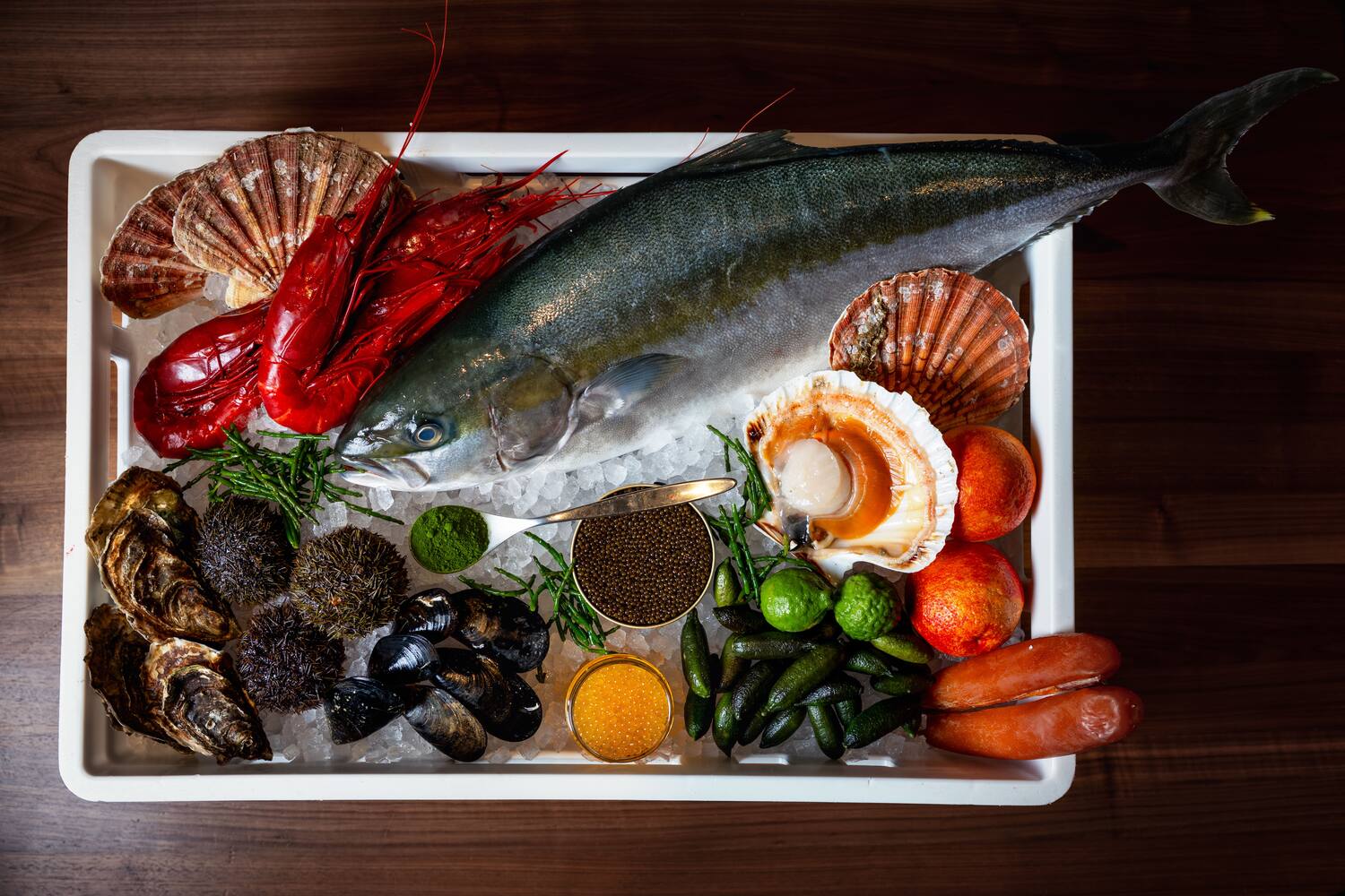 200 Jakobsmuscheln, 150 Austern. An diesem Mittwoch Ende Februar liegt das Meer in der Zürcher Altstadt. Genauer: im urgemütlichen «Lindenhofkeller» von 16-Punkte-Chef Sebastian Rösch. Der Grossmeister des raffinierten Soul Food hat in Zusammenarbeit mit Bianchi zum «Seafood-Kellerfest» geladen. Auf dem Programm: sechs traumhafte Kreationen mit dem Besten, was der von Schweizer Starchefs hochgeschätzte Comestibles-Händler aus dem Aargau zu bieten hat. 200 Jakobsmuscheln, 150 Austern und ebenso viele leuchtend rote Carabineros hat Rösch unter anderem bestellt. Allein schon der Anblick der taufrischen Ware lässt einem das Wasser im Mund zusammenlaufen. Bild oben: Seafood aus dem Hause Bianchi (unter dem Kopf des Fisches das Plankton-Pulver).