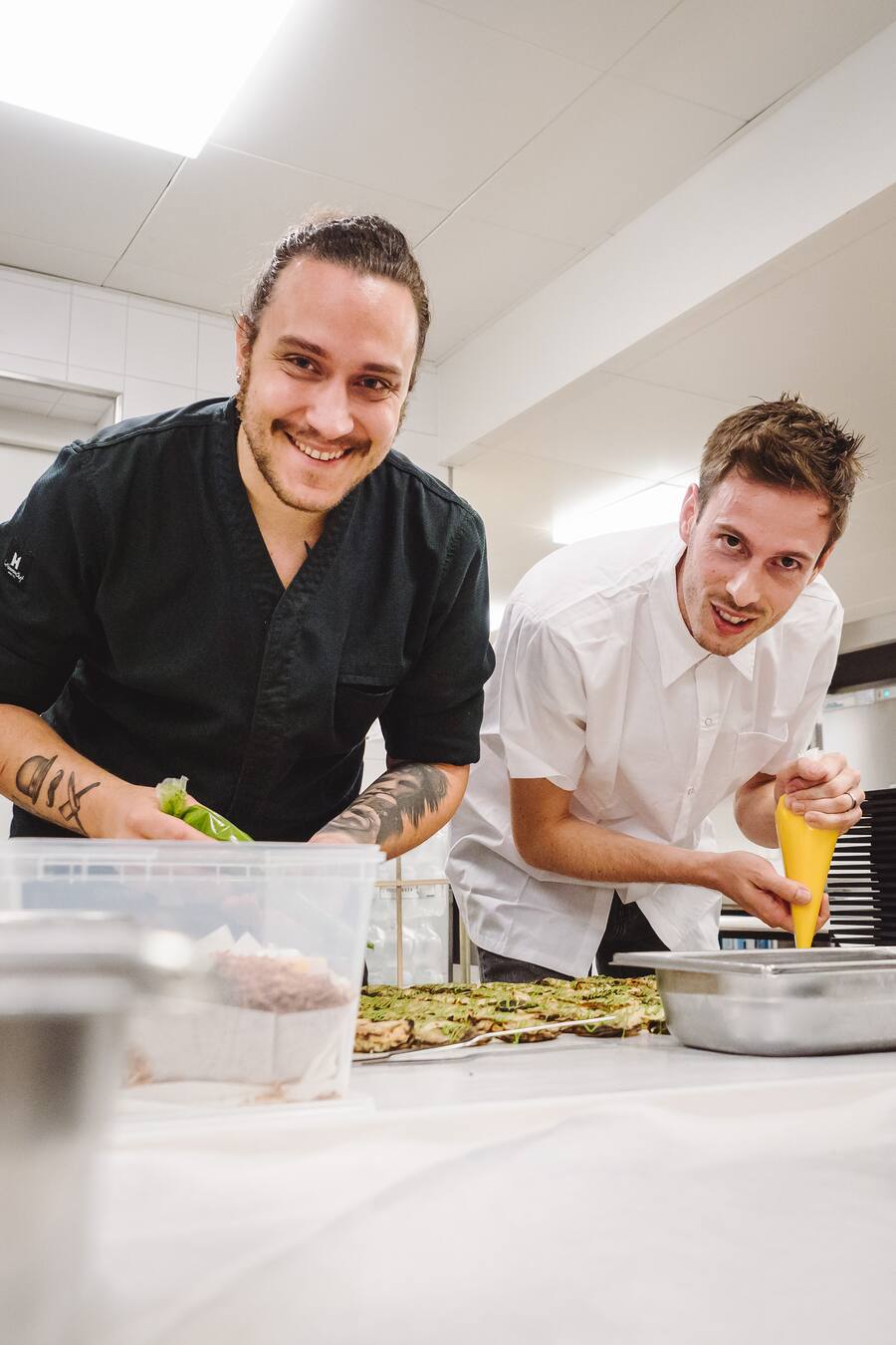 Fabian Fuchs und Markus Arnold richten in der Küche die Amuse Bouches an.