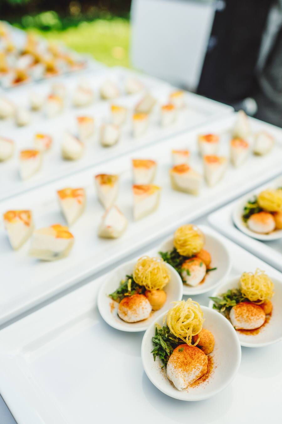 Das Fest ist eröffnet. Für die Gäste gibts schon kurz nach dem Einlass die ersten Häppchen. Die Youngsters von V-Zug sind für die Amuse Bouches verantwortlich. Fabian Fuchs macht ein Sellerie-Taco mit Eigelb, Silvio Germann servierte aus dem Food Truck ein Blütenmacaron mit Entenleber. Markus Arnold kommt aus Bern und bringt ein Seeländer Randentatar mit, Marcel Skibba verwöhnt die Gäste mit dem Wachtelei «Igniv». Das erste Fazit der Gäste zum Empfang: prima!