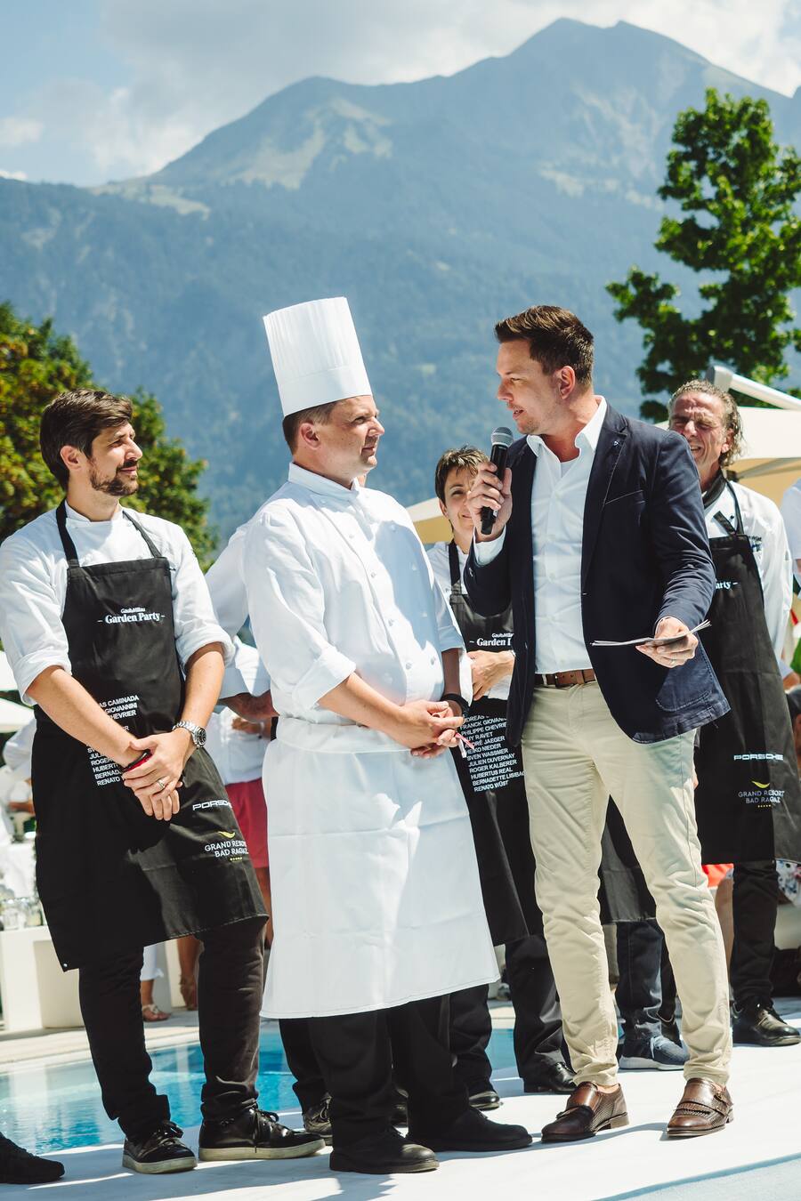 Coole Köche. Um 12.30 Uhr dann die offizielle Eröffnung. Moderator Sven Epiney empfängt alle Köche auf einer Brücke über dem Pool. «Keine Sorge, wir haben zum Test zwei Elefanten drüber gejagt», versicherte der TV-Mann noch bei der Probe. Ja, die Brücke vermag die 15 Köche und den Pâtissier des Jahres zu tragen. Die Starchefs scheinen ihren Auftritt auf dem Liegestuhl sichtlich zu geniessen. Auch der «Koch des Jahres» kam den weiten Weg von Crissier nach Bad Ragaz. «Wieso eigentlich? Ich weiss, dass du deine Küche selten verlässt», fragt Epiney. «Wir haben am Sonntag geschlossen», sagt Franck Giovannini ganz cool.